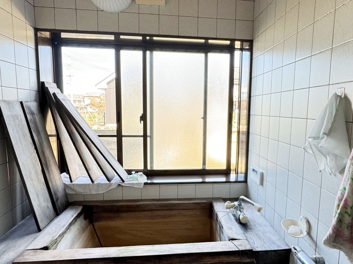 ヒノキの浴槽、洗い場中央にはすのこがしつらえてある豪華な浴室ですが、冬場のタイルの冷たさや大きい窓からの冷気が堪えるため、あたたかいユニットバスに交換することを決断されました。
